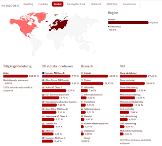Det är ju stora fina bolag i grunden men jag tycker att det är lite dubbelinvestering i Investor och Atlas Copco. Sedan kan jag tycka att man köpt en del konstiga bolag inom vätgasteknik. Visst bara typ 0,1% av portföljens värde. jag hade nog lagt dessa i andra bolag. Det finns en del nordiska bolag också. Fonden har över 400 olika innehav.