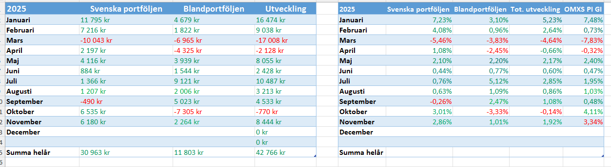 Den här månaden blev det extra köp på grund av omalokering av portföljen. Sålt Atlas, Astra på grund av innehav i dessa via Investor. Försökt komma in mer i dagligvaruhandeln via Mondelez som jag tycker är undervärderad. Axfood är i nuläget något dyr tycker jag men på sikt säkert en bra aktie. Nu får vi hoppas på tomterally i december, det blev ju inget förra året.