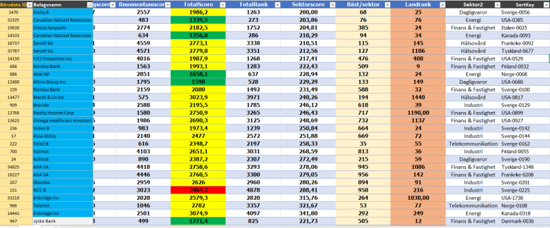Jag har i min screener lagt in alla bolag jag äger och låtit en formel styra så att de bolag som jag exporterar in i mitt excelblad blir blåa. Alla bolag kommer inte med som Industrivärlden och Investor eftersom de saknar EBITA-marginal. Jag köper investmentbolag efter substansrabatt och kvalite. Äger just nu Industrivärlden och Investor A och B. Så ser man till min screener har jag ett bolag jag bör sälja och det är NCC. NCC faller igenom på kvalitet då min screeners kvalitetsfilter ger NCC en hög score. Ju lägre score ju bättre ranking. I min export ligger det just nu 5690 bolag. 20% bäst rankade blir gröna (köpvärda) så ned till ranking 1138 är man grön. Gula bolag (behåll) är 60% och röda bolag 20% med sämst ranking (sälj). Mina regler är enkla.