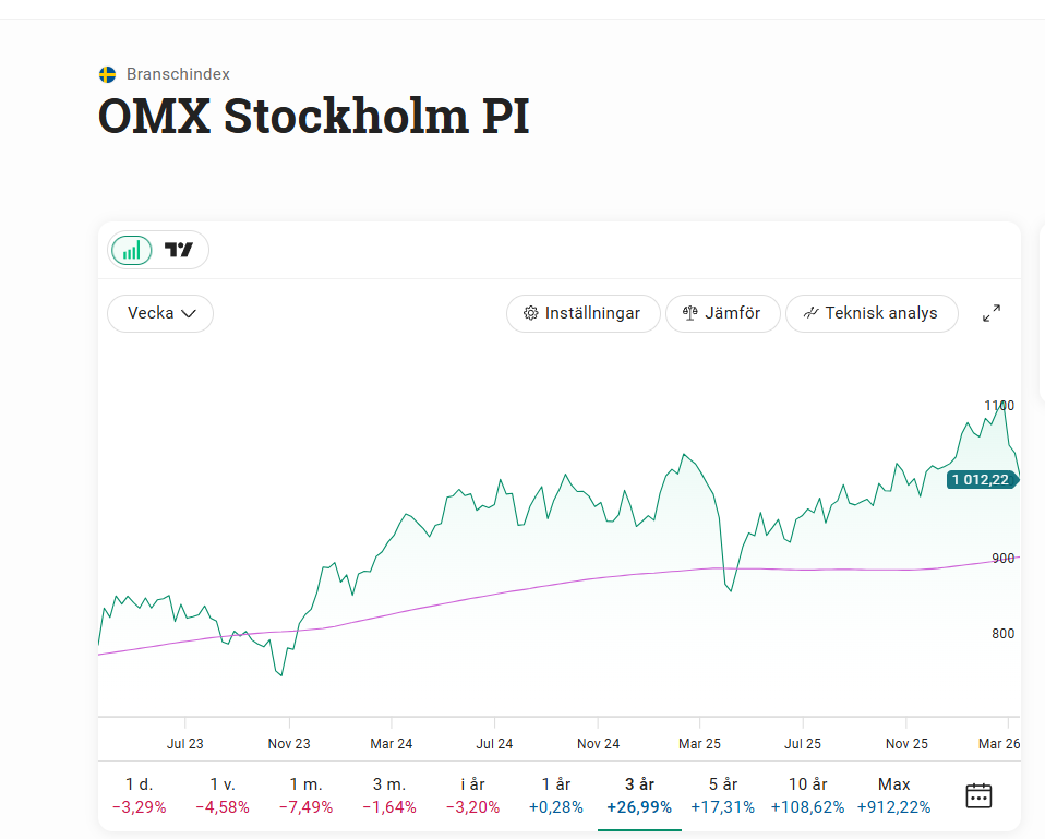 Det går oerhört tungt på världens börser. Är vi på väg in i en recession likt oljekrisen? Man får tycka och tänka vad man vill om oljan men det är fortfarande en stor del av vår ekonomi. Just nu ligger ett fat Brent-olja på cirka 120 dollar. Det enda som går bra just nu är olja och energi. Högt oljepris kommer ge högre produktions- och transportkostnader. Båtar vågar inte gå via Hormuzsundet ut med olja. Detta kommer slå på konsumtionen också. Sverige hade behövt lite stimuleringar av ekonomin just nu. Styrräntan ligger oförändrad på 1,75%. OMXSPI är under MA200 (glidande medelvärde 200 dagar). Senast det hände var Mars 2025.