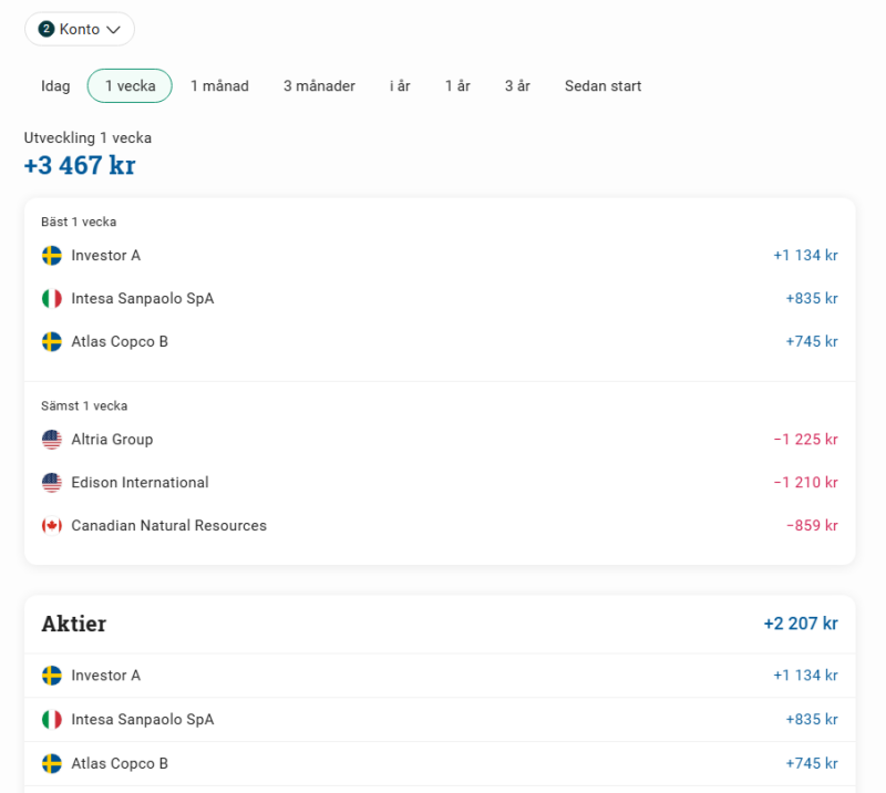 Mina portföljer tuggar på trots en ganska medioker vecka. Stockholmsbörsens bolag går starkt just nu (igen). Detta är ytterligare ett argument till att svenska kvalitetsbolag är goda investeringar. Jag äger