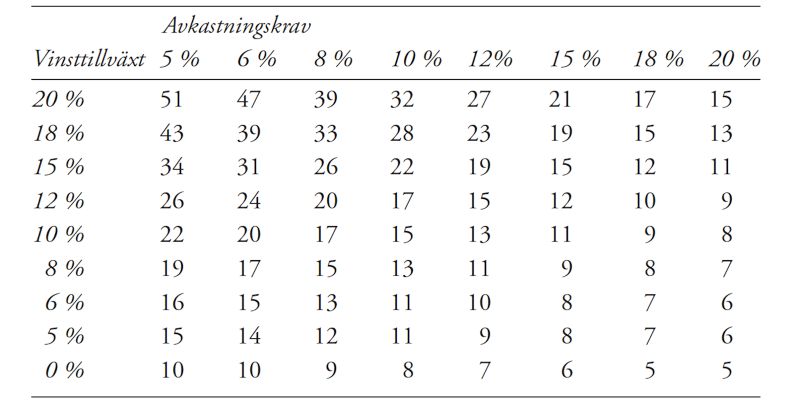 Vi kollar med tabellen. Vi tar avkastning 8% vinsttillväxt 6% Ger P/E 13.